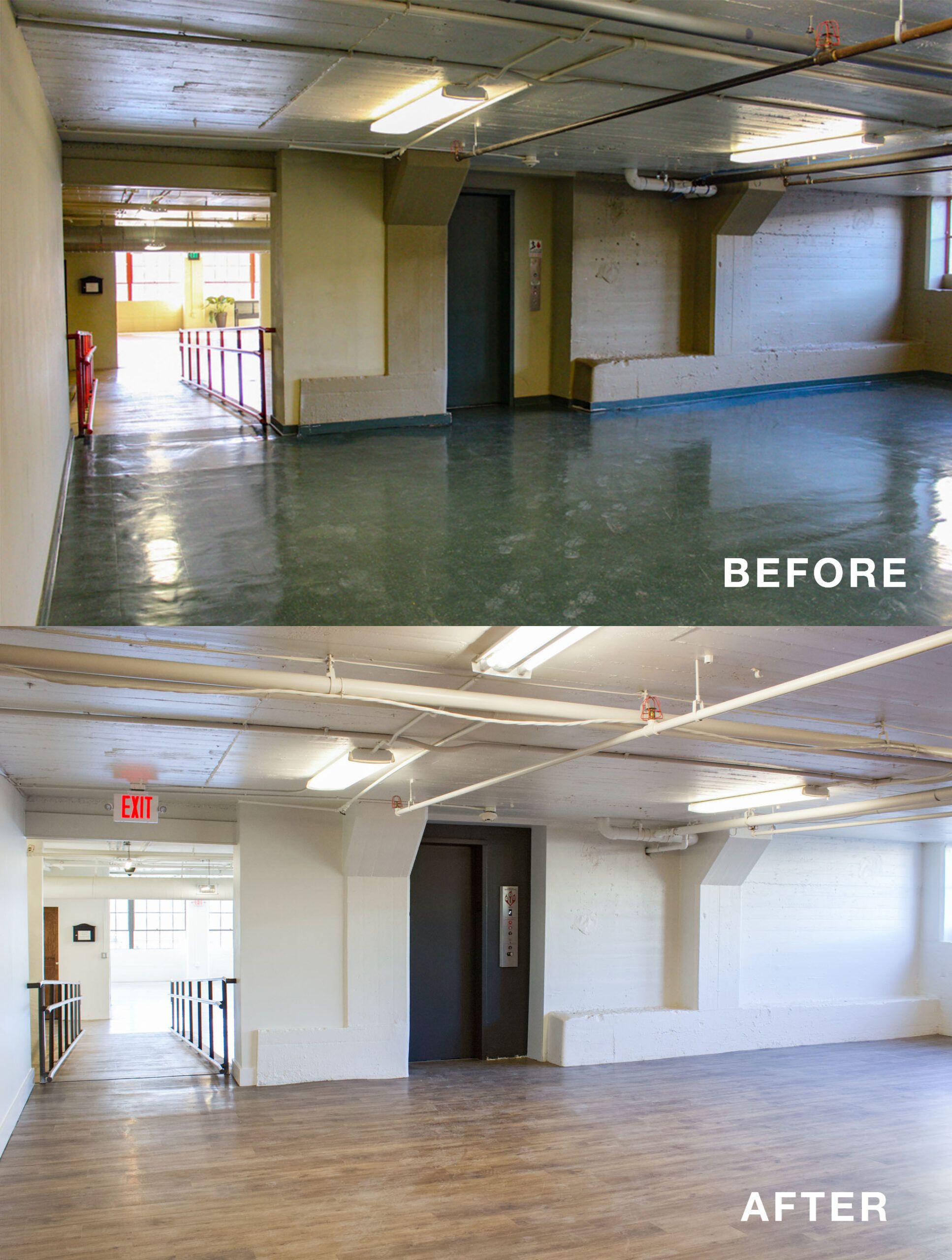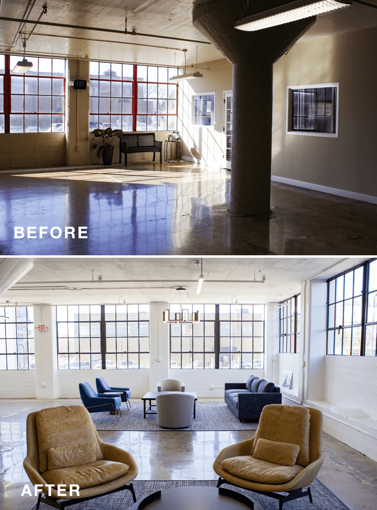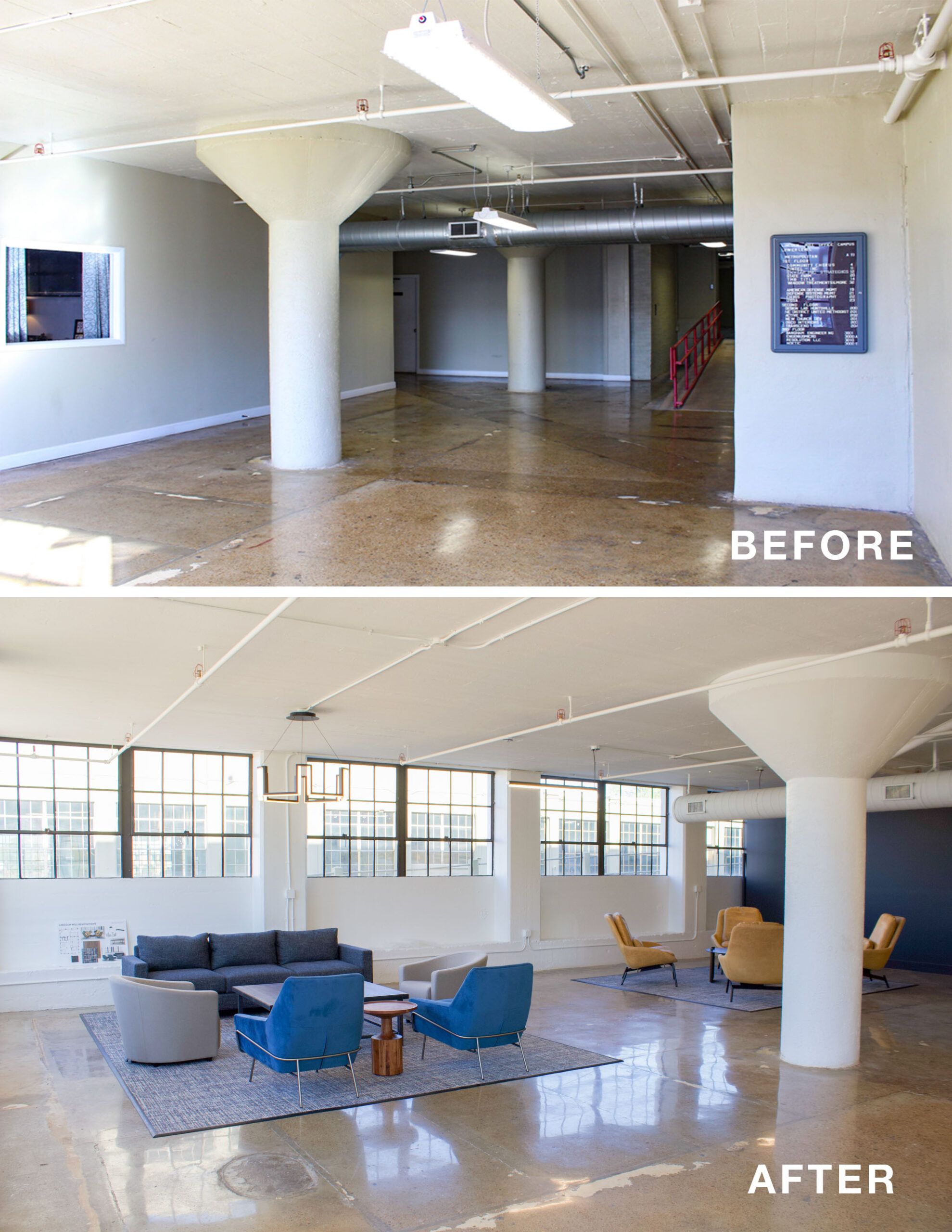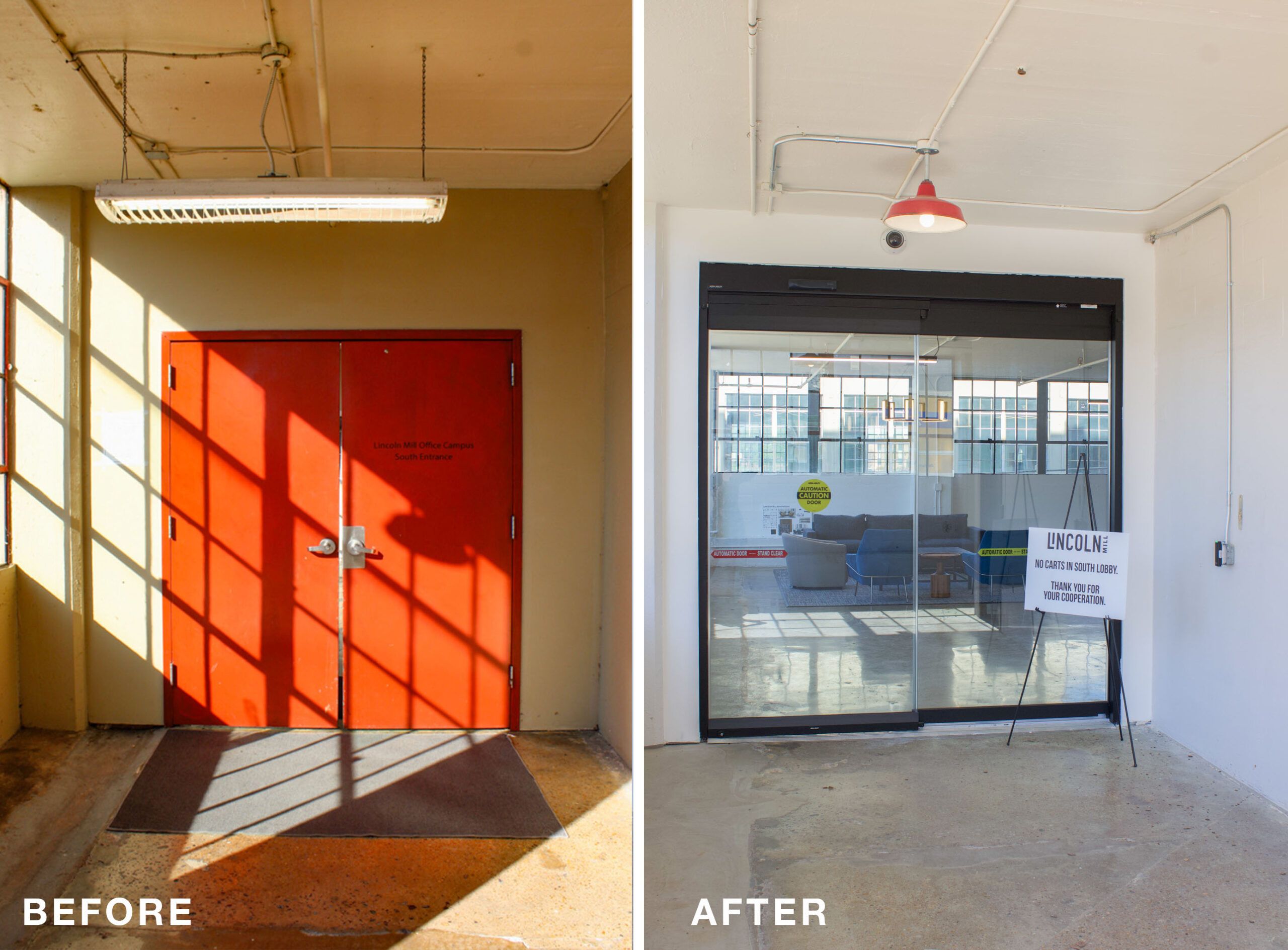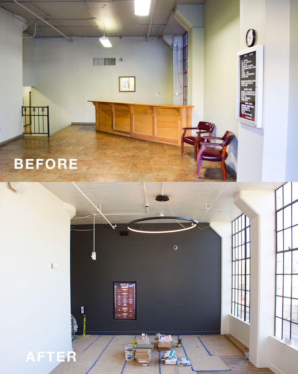 Walls have been removed to enhance natural light throughout the space, modern light fixtures have been added, and a fresh paint job provides a renewed look to a lobby that was once filled with shadows.