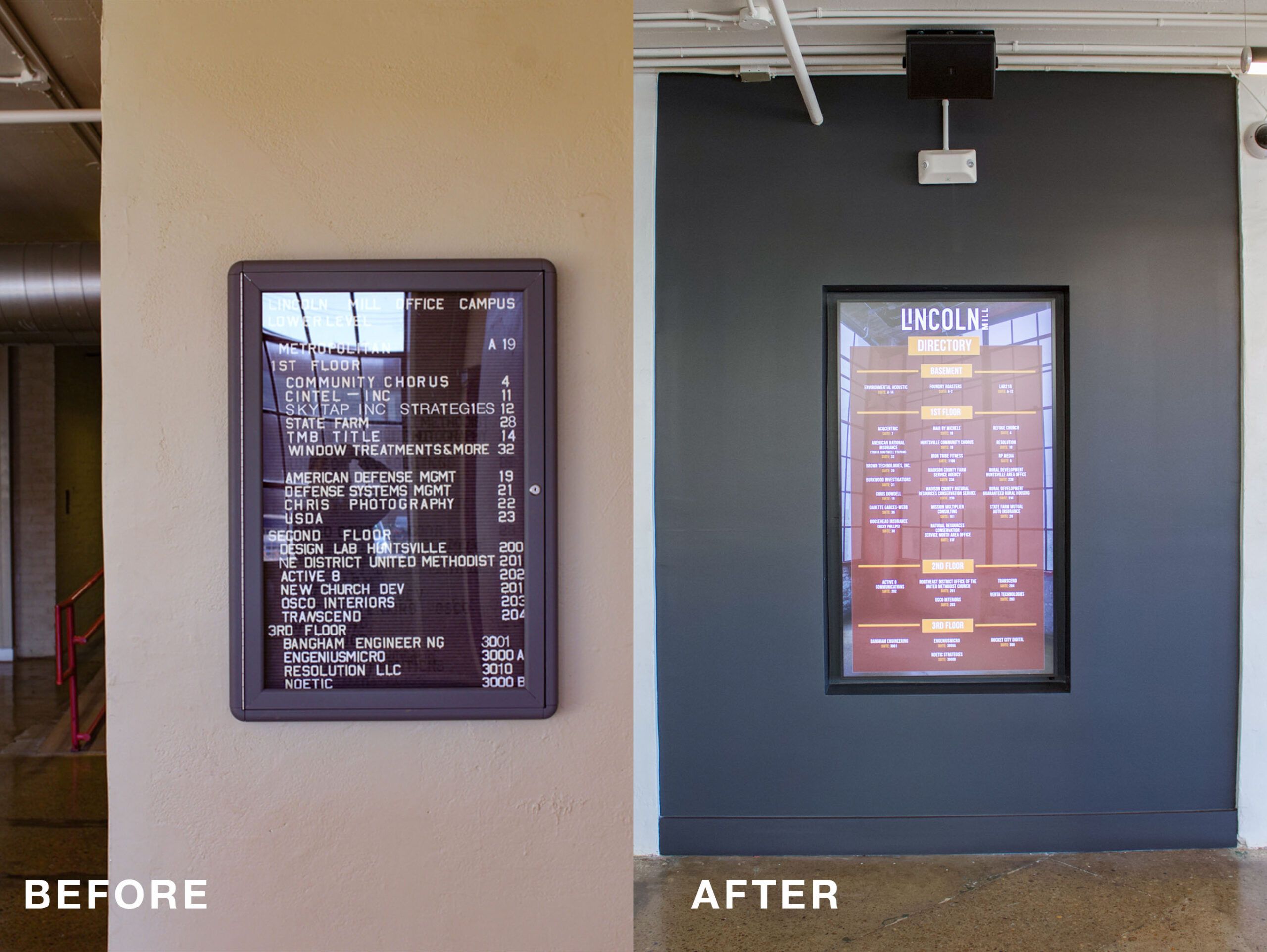 On the other side of the main building, in the North Lobby, similar modifications have taken place. This lobby has been improved with access to more natural lighting—thanks to giant windows—additional space, new lighting fixtures, a matching digital directory, and a paint job that complements the rest of the campus and its new aesthetic.