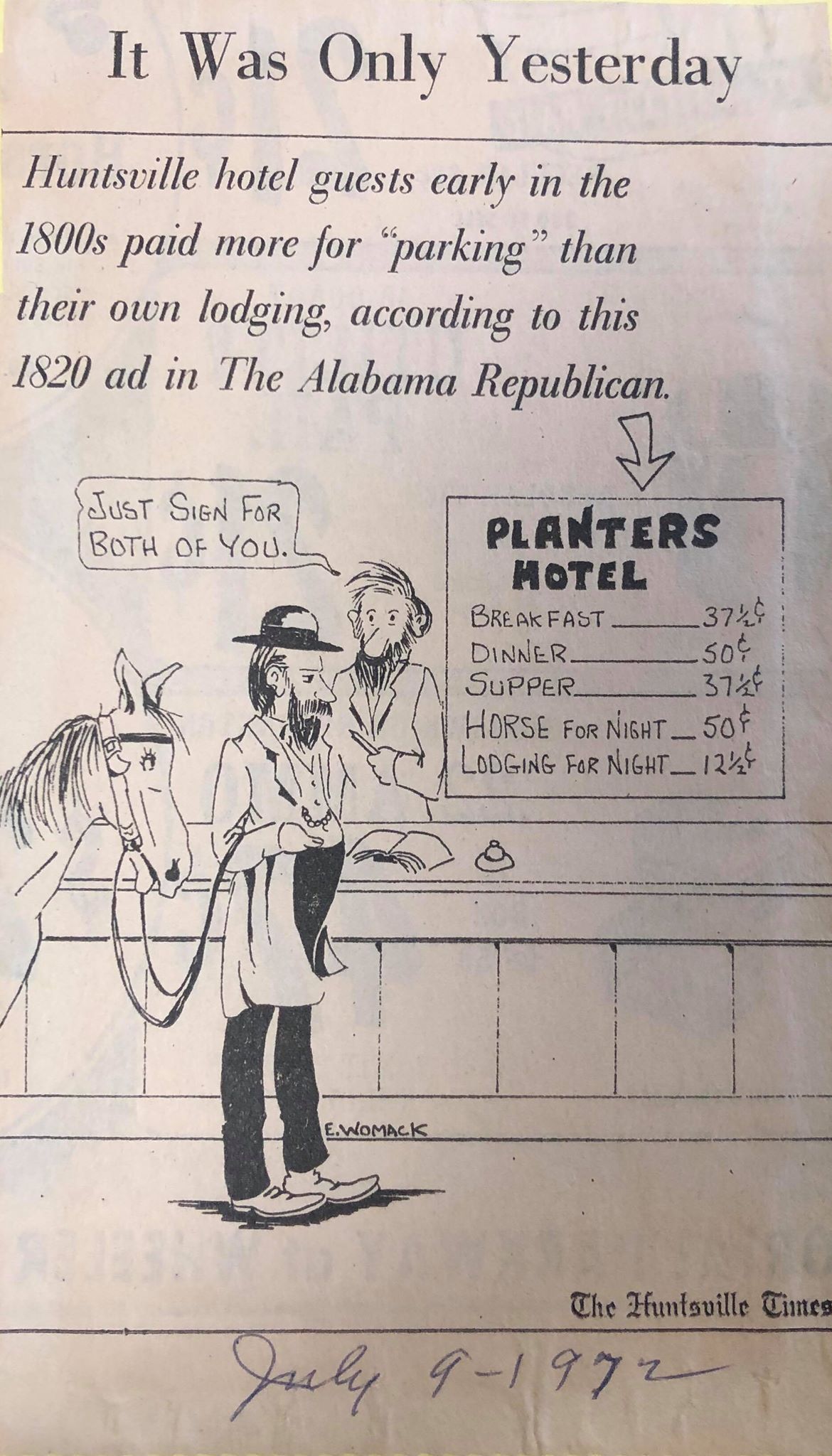 In a 1972 issue of The Huntsville Times, an 1820’s ad was released that was originally printed in The Alabama Republican. It included basic pricing for items like breakfast, dinner, lodging, and horse stables.