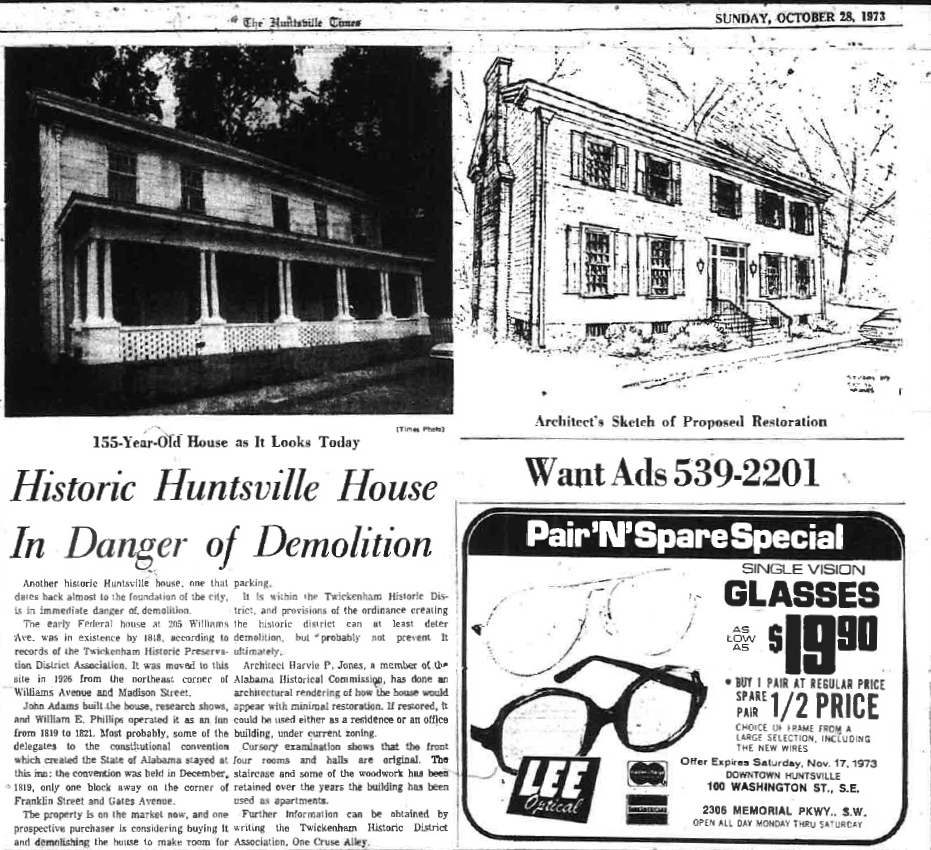 On Sunday, October 28, 1973, he released his sketches to The Huntsville Times, which showed the property as it is today. At the time, the house was around 155 years old, the front four rooms were in their original state, and much of the woodwork had been preserved.
