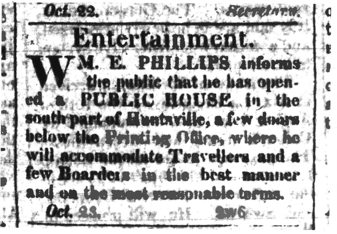 “William E. Phillips informs the public that he has opened a PUBLIC HOUSE in the south part of Huntsville, a few doors below the Printing Office, where he will accommodate Travelers and Boarders in the best manner and on the most reasonable terms.”